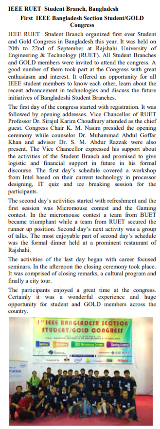 IEEE RUET Student Branch organized first-ever Student and Gold Congress in Bangladesh on 20-22 September 2012 ar Rajshahi University of Engineering & Technology (RUET) where all student branches and GOLD members were invited to attend. The mega event has been featured in IEEE R10 Newsletter December-2012 (page 29).